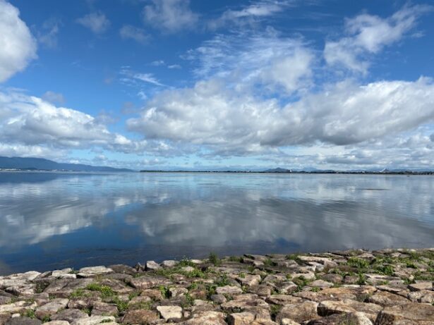 こんにちは! 京都出町TAKENAKAです。朝ポタメンバーのYさん、大原から琵琶湖方面をサイクリング。びわ湖の湖面が鏡のようになっていますね。