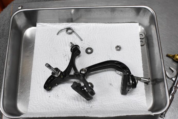 こんにちは! 京都出町TAKENAKAです。BMCロードバイクをご愛用のお客様からメンテナンスを承りました。ありがとうございます。タイヤ交換でご来店下さり、交換作業が終わったところで、「フロントブレーキの調子が悪いのでちょっと見て…」と言うことで確認しましたらリターンスプリングが折れていました。純正スプリングのストックがありましたのでブレーキキャリパーをオーバーホールしまして完了!