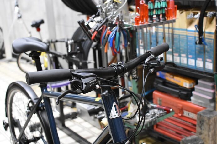 こんにちは! 京都出町TAKENAKAです。MARUIオリジナルクロスバイク C101が仕上がりました。フレームカラーは6色用意されている中からネイビーです。ハンドルの形状は少しアップしていますので緩めの前傾姿勢で乗っていただけます。今回は標準仕様に加えて、フェンダー取り付け、タイヤをシュワルベ デルタクルーザープラスに入れ替えなども承っております。