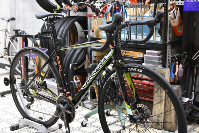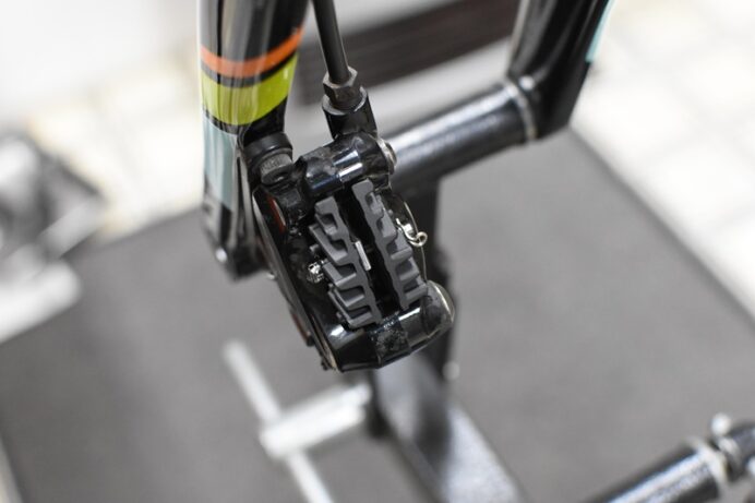 こんにちは! 京都出町TAKENAKAです。お待たせしました、CARRERA(カレラ) ER-01のオーバーホールが仕上がりました。1件、珍しい破損を発見。フロントブレーキキャリパーのブレーキパッドを装着するボルトの先端が欠損していました。通常の使用ではこの先端に何かが当たるようなことは考えにくく不思議なことです。この先端にはもしボルトが緩んでも抜け落ちないようにスナップリテーナーというパーツを取り付けますが、ちょうどその取り付け部が欠損していますので新しいボルトに交換しました。“メンテナンスで安心安全”。