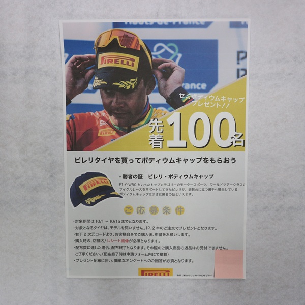 こんにちは! 京都出町TAKENAKAです。PIRELLI(ピレリ) ポディウムキャップ プレゼントキャンペーン! 10月1日~10月15日の期間で先着100名様。ピレリタイヤ2本お買い上げでご応募いただけます。タイヤ交換をご検討中の方はぜひこの期間中に!店頭品、お取り寄せ品どちらも対象です。
