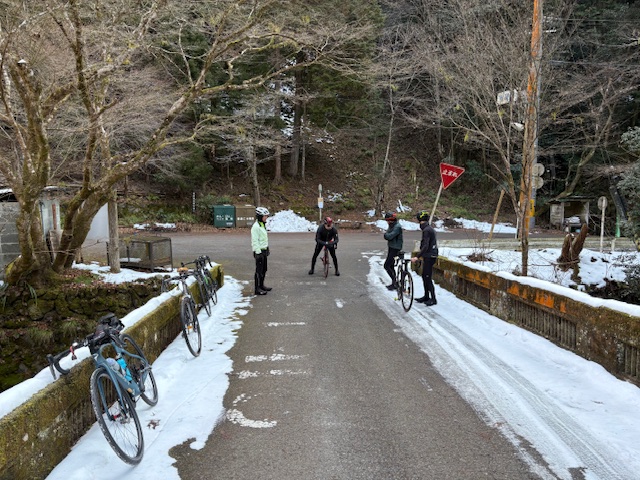 こんにちは! 京都出町TAKENAKAです。2月1日(日)朝ポタ、雲ケ畑へ行って来ました。ご参加ありがとうございました。大原の予定でしたが、スタートしてしばらく走りますと、どうも私の体調がイマイチだったもので峠の無い雲ケ畑コースに変更させていただきました。雲ケ畑入り口の気温表示は行きが0℃、帰りは3℃でよく冷えていましたが、青空が広がり気持ち良い朝でした。先日山間部に降った雪が岩屋橋には少し残っていました。来週は体調の良い状態で走れることを願っています。