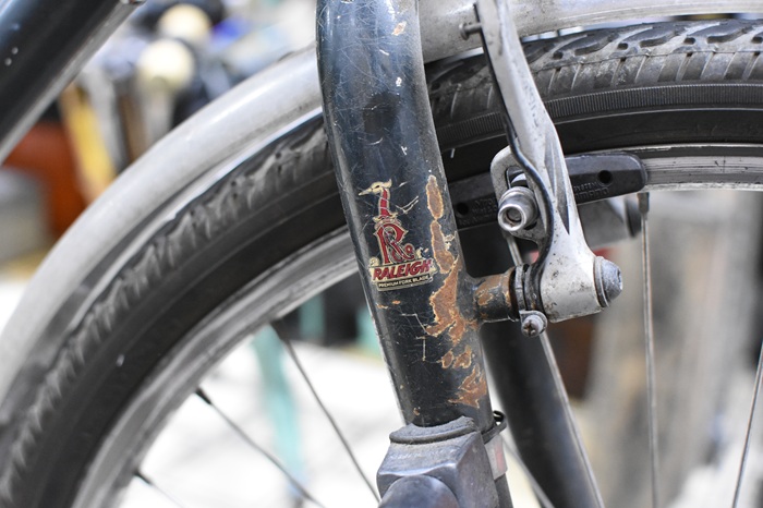 こんにちは! 京都出町TAKENAKAです。いい感じで使いこまれたRALEIGH(ラレー)のメンテナンスを承りました。ありがとうございます。新しいフロントバスケット取り付け、ブレーキシュー交換など。メンテナンスで安心安全!