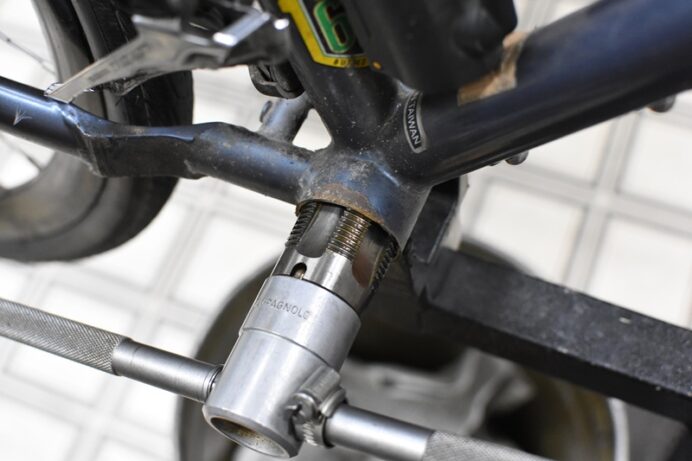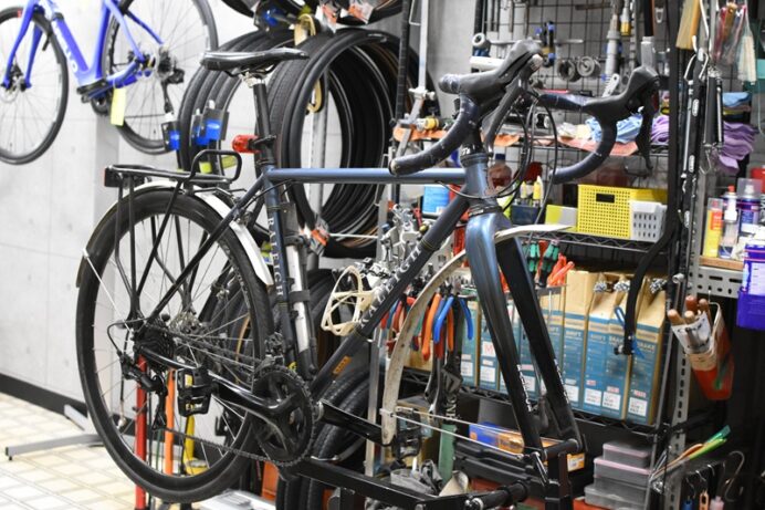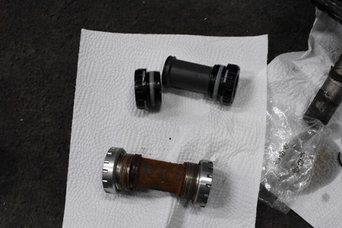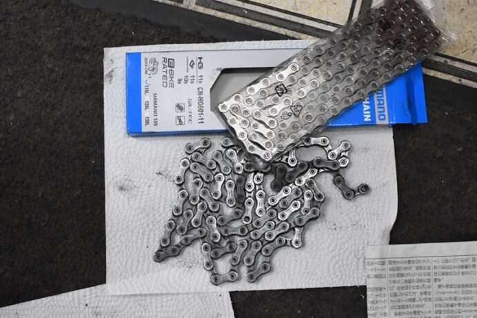 こんにちは! 京都出町TAKENAKAです。ラレー CRCをご愛用のお客様からメンテナンスを承りました。ありがとうございます。消耗品を定期的に交換しながら、現在の走行距離は50,000kmを越えています。この距離で初交換となりましたのはBB(ボトムブラケット)ユニットです。いつもシマノ純正BBユニットはたいへん耐久性がありますと言っていますが、さすがに50,000kmは限界でした。まるでベアリングがどこかへ飛んで行ったのではないかという状態です。50,000kmも使っているので、取り外しに手こずるのでは…、と心配しましたが無理なく外せました。カンパニョーロのBBタップでネジを整えまして、新しいシマノ製BBユニットを取り付けました。チェーンとディレーラーのプーリーも交換しました。ガイドプーリー、テンションプーリー共に、まるで削りたての鉛筆の先のようになっていました。オーナーによりますと目標10万キロ! メンテナンスで安心安全!
