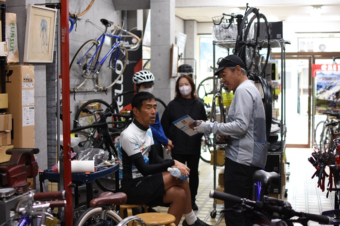 こんにちは! 京都出町TAKENAKAです。四国ツーリングから帰って来られたUさんがご来店。ちょうど居合わせた朝ポタメンバーと土産話で盛り上がっていました。